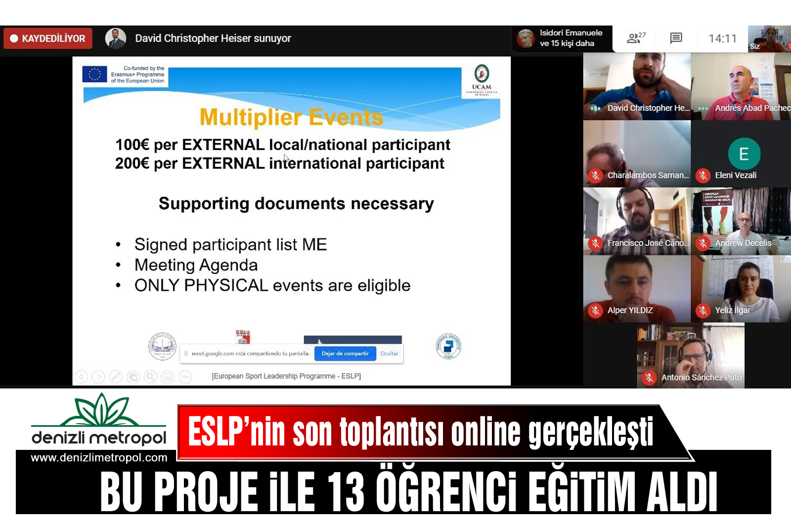 Spor alanında Erasmus+Sport projesi olarak kabul gören ve Pamukkale Üniversitesi ile birlikte İspanya, İtalya, Malta, Yunanistan ve İngiltere gibi ülkelerden de ortakların yer aldığı Avrupa Spor Liderliği Programı (ESLP) projesinin son toplantısı online olarak düzenlendi. Projenin İspanya'da yapılması planlanan final toplantısı, dünyada devam etmekte olan korona virüs salgın önlemleri nedeniyle online olarak gerçekleşti.