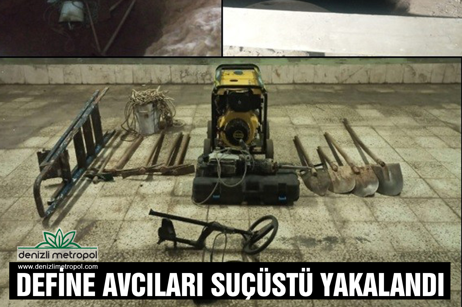 Denizli’de define aramak için bağ evine giden 8 şahsı jandarma ekipleri suçüstü yakaladı. Define avcıları, tarihi küp ve tarihi eser niteliğindeki taşın yanı sıra define aramak için kullanılan malzemeler ile birlikte gözaltına alındı.