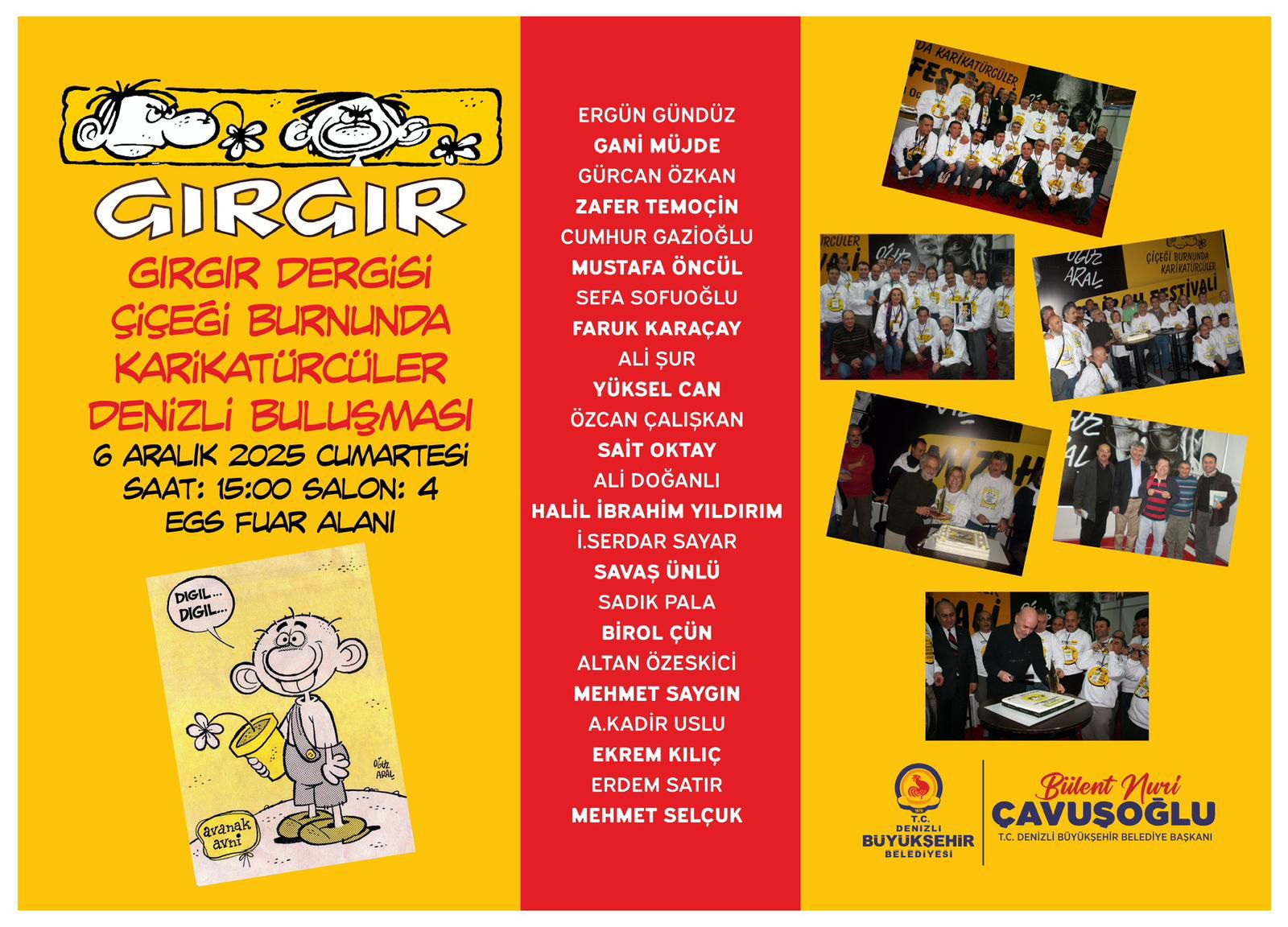 Burnunda Karikatürcüler Denizli Buluşması”, 6 Aralık 2025 Cumartesi günü saat 15.00’te Salon 4’te gerçekleştirilecek. Gani Müjde, Mustafa Öncül, Erdem