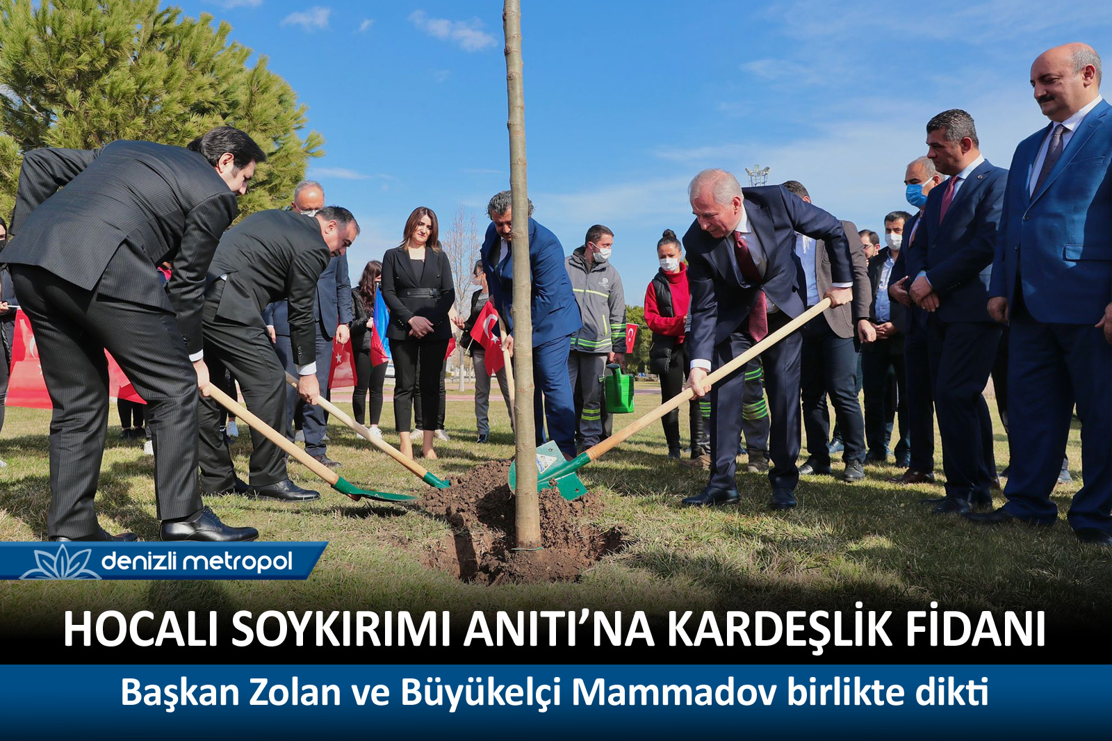Başkan Zolan konuşmasını şöyle sürdürdü: “Acınızda, mücadelenizde her zaman tek millet olarak beraber olacağız. Bu da geleceğimize kardeşliğimizi anlatmak anlamında bir anıt olacak. Ecdadımızla ne kadar gurur duysak azdır. Bizim geçmişimizde çocuklara, kadınlara, yaşlılara katliam yoktur, arkadan vurmak yoktur. Savaştıysak cephede mücadele ederiz. Ama maalesef insanlığını kaybetmiş olanlar bu katliamı gerçekleştirmişlerdir.” Konuşmaların ardından Büyükelçi Mammadov buradaki öğrencilere Hocalı Soykırımı’nı anlattı. Daha sonra Büyükelçi Mammadov, Başkan Zolan ve beraberindekiler Hocalı Soykırım Anıtı’na kırmızı karanfil bıraktı, birlikte kardeşlik fidanı dikti. Fidanın dikildiği toprağa ise Büyükelçi Mammadov’un Türkiye ve Azerbaycan’ın Dağlık Karabağ’daki Şuşa şehrinde müttefiklik anlaşması olan Şuşa Beyannamesi’ni imzaladığı noktadan getirdiği toprak kondu. Toprakla buluşturulan çınar ağacı fidanına ise Şuşa adı verildi.