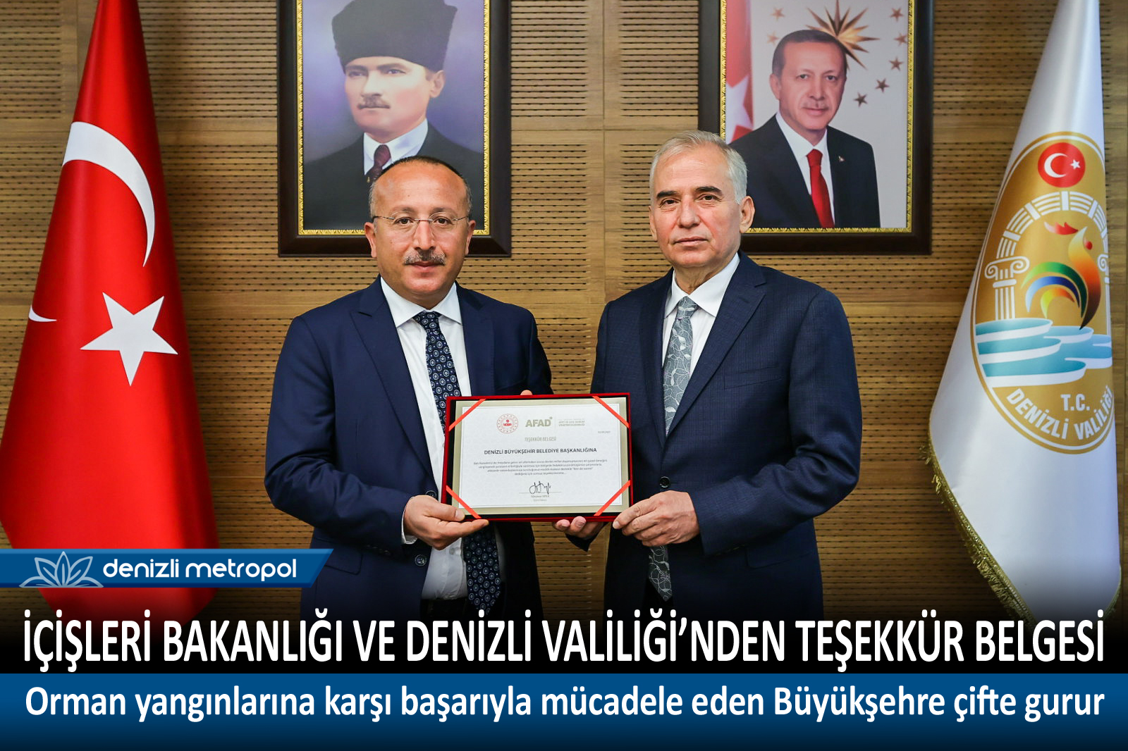 Denizli ve çevre illerde yaşanan orman yangınlarına karşı başarılı şekilde mücadele eden Denizli Büyükşehir Belediyesi, İçişleri Bakanlığı ve Denizli Valiliği tarafından "Teşekkür Belgesi" ile ödüllendirildi.