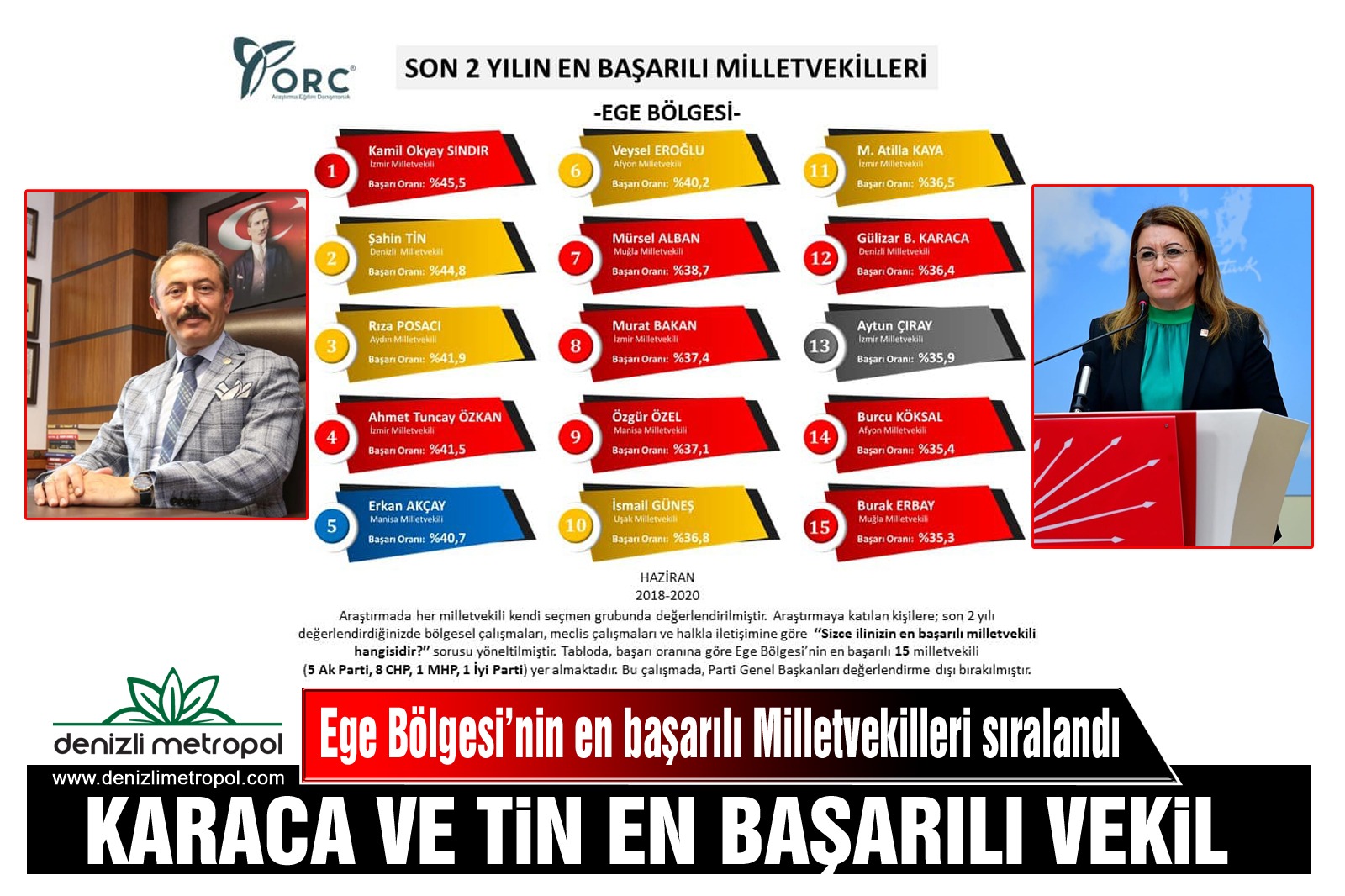 ORC Araştırma Şirketi tarafından yapılan Ege Bölgesi, en başarılı milletvekilleri araştırmasında Denizli'den 2 milletvekili sıralamada kendine yer buldu. Listede AK Parti Denizli Milletvekili Şahin Tin 2. Sırada, CHP Genel Başkan Yardımcısı ve Denizli Milletvekili Gülizar Biçer Karaca ise 12. Sırada yer aldı.