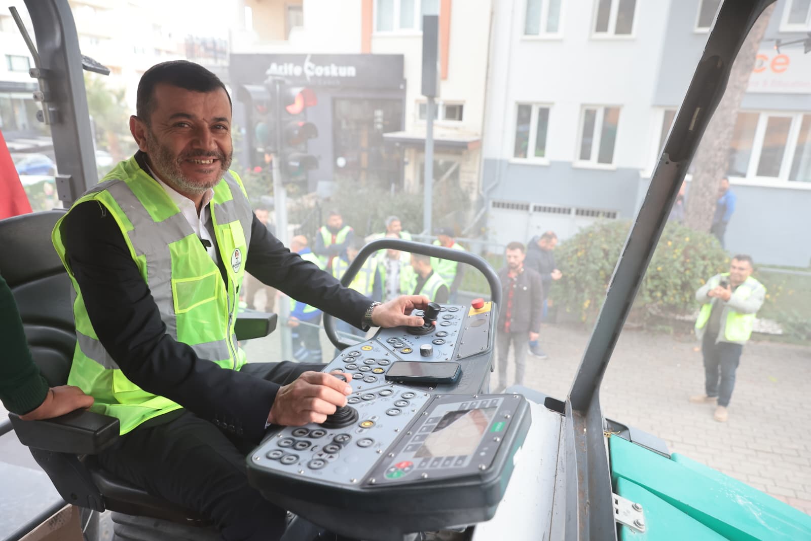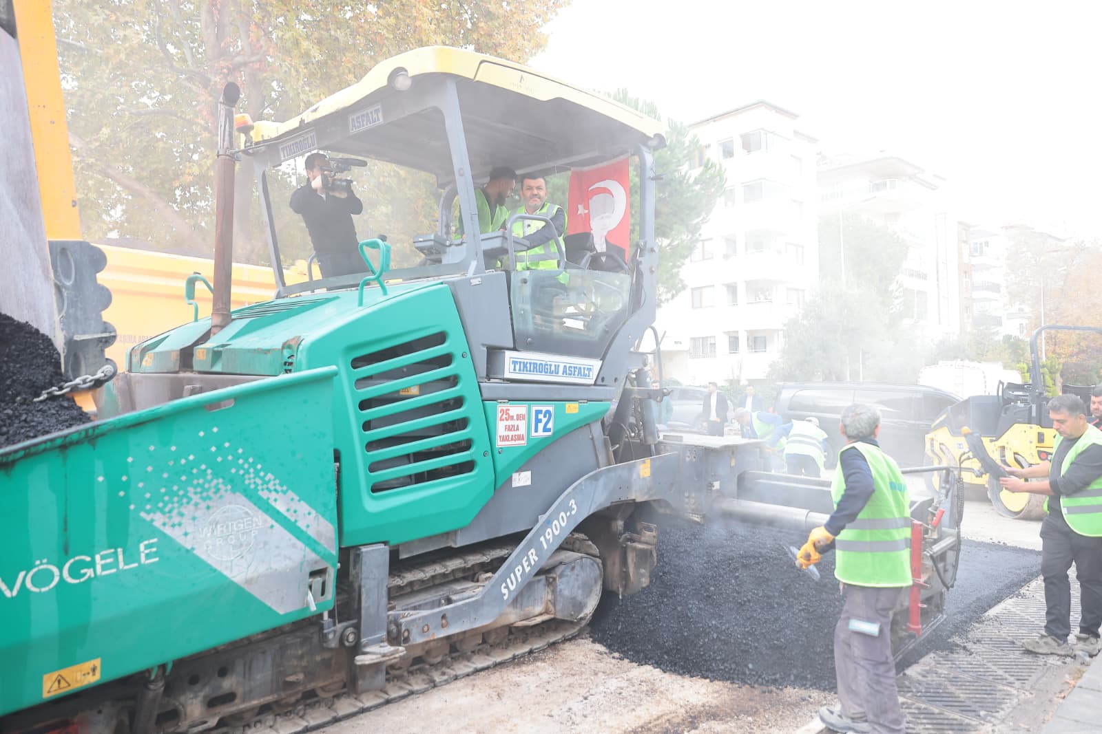 asfalt serim makinesini kullanarak çalışmalara eşlik etti ve sahada görev yapan personele kolaylıklar diledi.