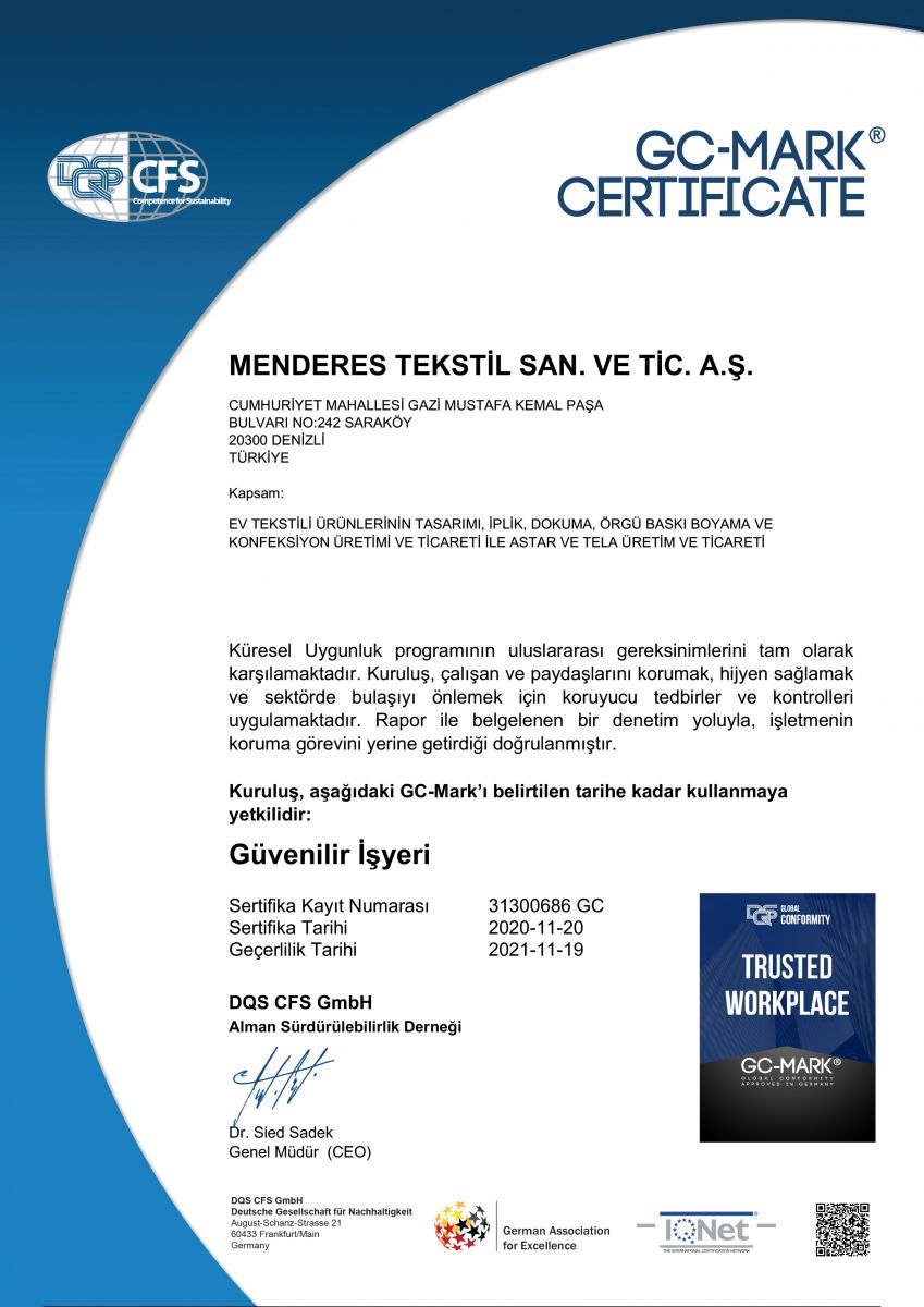 Menderes Tekstil’e, pandemi sürecinde aldığı önlemler ve üretim sürecinde sağladığı hijyen kontrolü nedeniyle, Uluslararası sertifikasyon kuruluşu DQS tarafından Güvenilir İşyeri Sertifikası verildi. Sertifikasyon sürecinde yapılan denetimlerde, Menderes Tekstil’de alınan önlemlerin küresel uygunluk programının uluslararası gereksinimlerini tam olarak karşıladığı belirtildi.