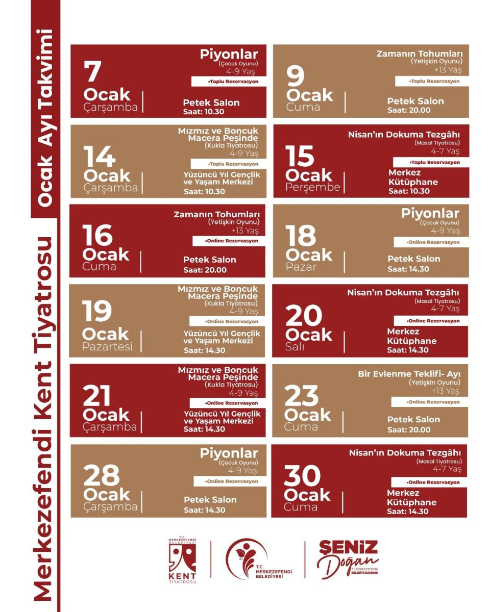 Merkezefendi Kent Tiyatrosu’nun Ocak ayı oyun takvimi belediyenin resmi internet sitesi üzerinden