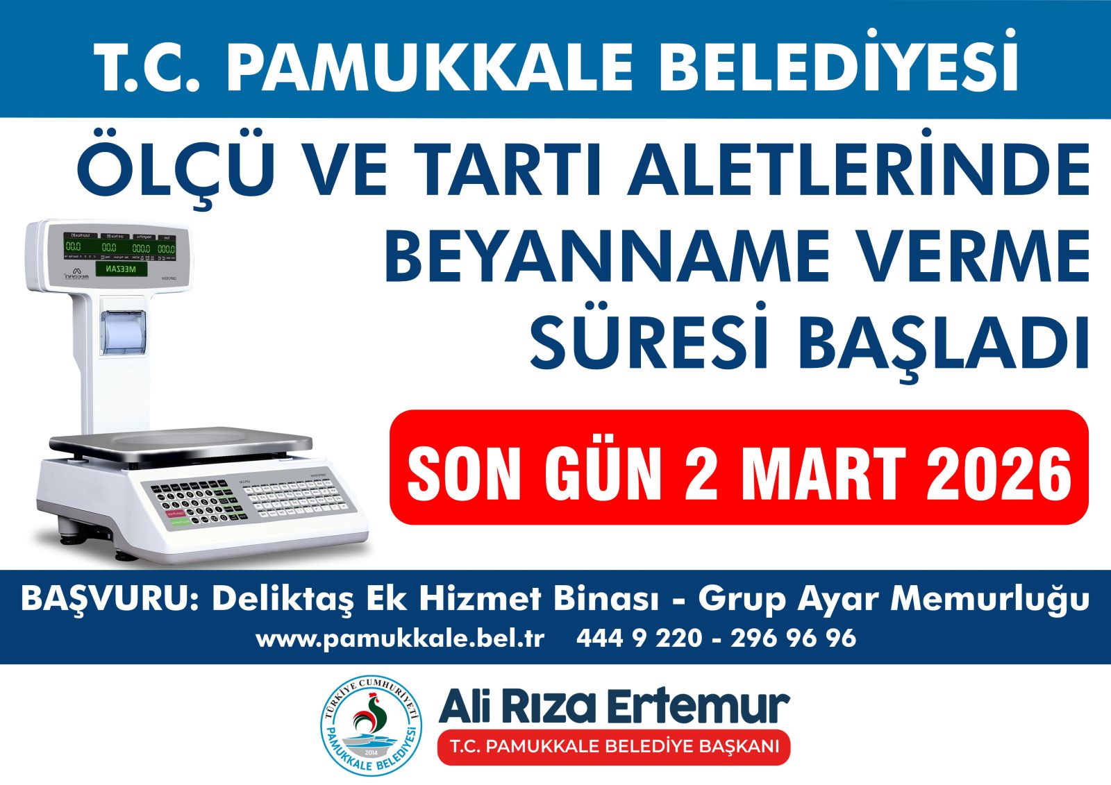 aletlerinin iki yılda bir periyodik muayeneden geçirilmesi gerektiği, damga süresi dolan aletler için ise 2 Mart 2026 tarihine kadar müracaat edilmesinin zorunlu olduğu belirtildi. Pamukkale Belediyesi tarafından, ilçe genelinde faaliyet gösteren esnaflara, ölçü ve tartı