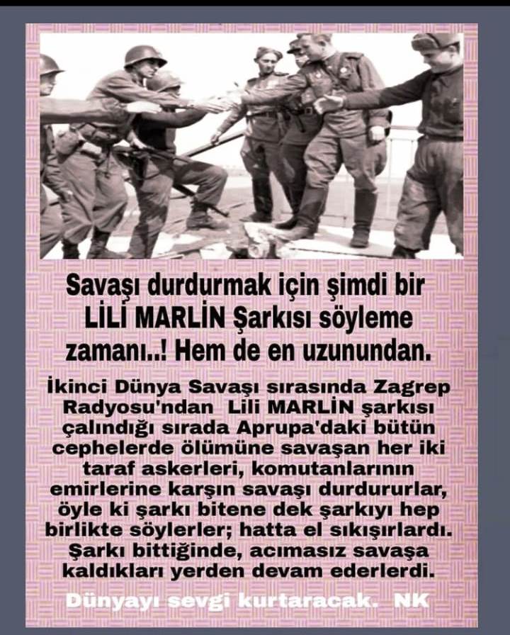 Tanınmış dershaneci ve emekli Türkçe öğretmeni Necati Karaçay sosyal medya hesabında paylaştı; “Savaşı durdurmak için şimdi de bir Lili Marlin şarkısı söyleme zamanı..! Hem de en uzunundan. İkinci Dünya Savaşı sırasında Zagrep Radyosu’nda Lili Marlin şarkısı çalındığında Avrupa’daki bütün cephelerde ölümüne savaşan her iki taraf askerleri hiçbir komutanın emri olmadan savaşı durdururlar, öyle ki şarkı bitene dek şarkıyı hep birlikte söylerler; hatta el sıkışırlardı. Şarkı bittiğinde, acımasız savaşa kaldıkları yerden devam ederlerdi. Dünyayı Sevgi kurtaracak. NK”